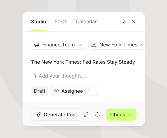 Pick an article. Add your take. AI drafts the post in your voice. One click checks it against SEC, FDA, FTC, and state regulations. Approval workflows give compliance teams control without creating delays.
