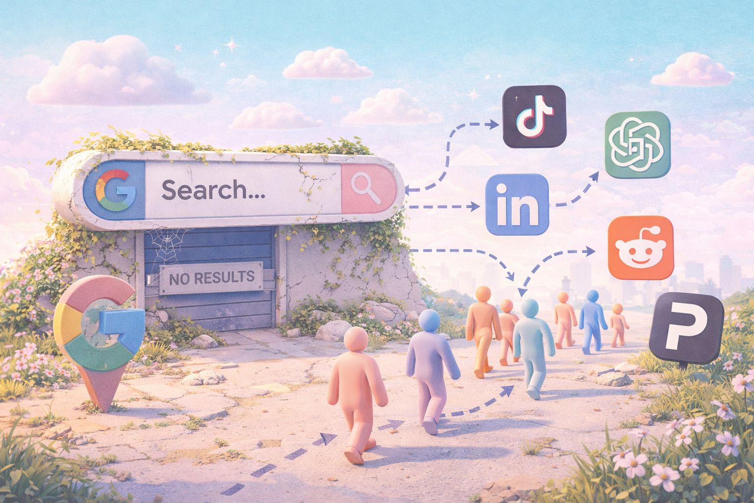 Here is a thought experiment. Ask someone under 25 how they found their last favourite restaurant. Odds are the answer is not "I Googled it." It might be a TikTok that showed up on their For You page. A thread on Reddit. A voice answer from ChatGPT. A LinkedIn post from someone they half-follow. Maybe they asked Perplexity and never clicked a single link.